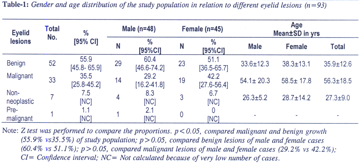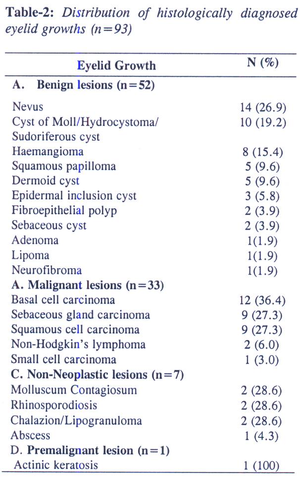 Out of total 93 eyelid growth, 55.9% were benign lesions while 35.5% and 7.5% were malignant and non-neoplastic lesions respectively (Table-1). Benign lesions of the eyelid was significantly higher (p<0.05) than that of malignant lesions. There was only one case of premalignant lesion in a 65 years old male. The most common location of the eyelid lesions was upper eyelid (51.8%) while lower eyelids had 37.6% lesions.