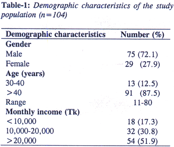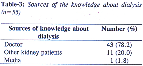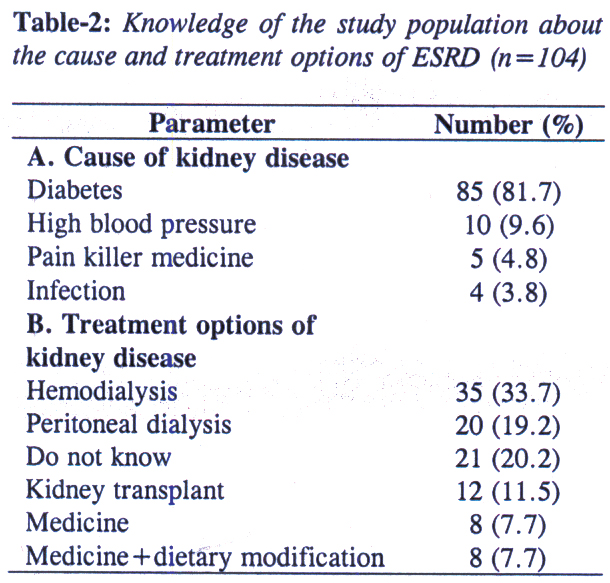 Out of 104 patients 87.5% were more than 40 years of age and 72.1% were male. Of the 104 participants, 51.9% had monthly income of more than Tk. 20,000.Table-1shows the detail age, gender and average monthly family income of the study population. Majority patients (81.7%) stated diabetes as the cause of kidney disease while 9.6% mentioned high blood pressure and only a few (4.8% and 3.8%) mentioned pain killer medicine and infection as the cause (Table2). Of the total respondents, 55 (52.9%) knew dialysis as the treatment of ESRD of which 35 (33.7%) and 20 (19.2%) mentioned hemodialysis and PD respectively. Only 11.5% mentioned kidney transplant as an option. Most of the patients (78.2%) gathered knowledge about dialysis from doctors while only 20.8% and 1.8% knew it from other patients and media respectively (Table 3).