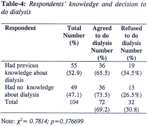 Methods: This cross sectional descriptive study was done on 104 patients with ESRD requiring immediate dialysis. This study was conducted in the department of Nephrology, BIRDEM General Hospital, Dhaka, Bangladesh over a period of six months. After obtaining informed consent the participants were given a self-administered questionnaire that included questions on socio-demographic status, age, gender, different aspects of knowledge about dialysis and the reasons to accept and refuse dialysis for the treatment of ESRD.