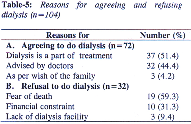 It was interesting to note that prior knowledge about dialysis as a modality of treatment of ESRD did not have any significant influence on the decision to do dialysis or not (Table 4). Doctors’ advice was the main reason to decide in favor of doing dialysis. On the other hand, fear of death (59.3%) and financial constrains (31.3%) were the main reason to refuse dialysis. Therefore, proper counseling regarding its beneficial aspect like improved quality of life and availability of facility at low cost would help people to accept dialysis for the treatment of ESRD. It has been reported earlier that in 60% case, fear of death was the reason for non-compliance to do dialysis in ESRD [5].