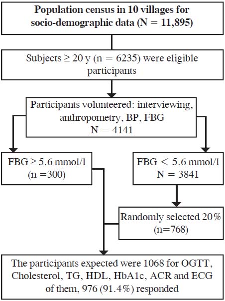 A population of ten villages of Nandail sub-district under Mymensingh was selected purposively. The study area is situated at a distance of ~150 km from Dhaka City. These people live mainly on cultivation. A few of them are involved in small scale business. Very few of them have mixed occupation like service and / or business in addition to their main agrarian origin. A population census was conducted for socio-demographic information. The variables were age, sex, education, occupation, annual income, family size, smoking habits, religion and housing condition. In addition, family history of diabetes, coronary heart disease and stroke was also collected. A questionnaire on the population census was finalized after a field trial. All the collected census data of all age groups were entered into a computer. From this data set, the subjects were enlisted as eligible participants. All men and women of age 20 years or more were considered eligible with the exception of pregnant mothers and of those who were suffering from severe illness.