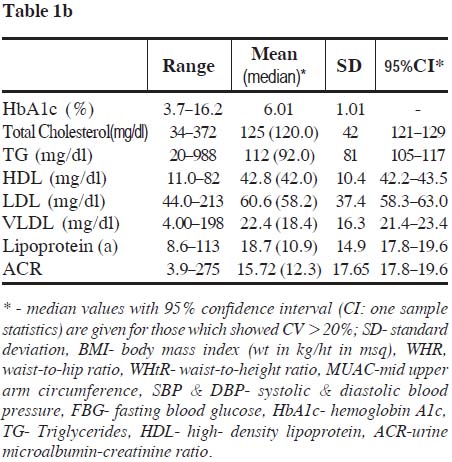Statistical analyses– The prevalence rates of CHD are given in percentages. The socio-demographic, anthropometric and biochemical characteristic are shown in mean with standard deviation (SD). For some variables median and 95% confidence interval were provided when SD exceeded 20%. Chi sq tests were done for the association of CHD with conventional risk variables. Odds ratio was estimated only when a significant association was found. When OR was significant, logistic regression was undertaken to quantify risk for contributing CHD. The level of significance was taken at p<0.05 for almost all statistical tests if not otherwise specified. All statistical analyses were carried out by SPSS+ package (Version 10.05).