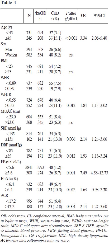 Table-3 shows the comparison of characteristics between subjects with and without CHD. The subjects with CHD had a significantly higher age (p<0.001), WHtR (p<0.03), SBP (p<0.01), DBP (p<0.05), FBG (p<0.001) and ACR (p<0.01) than their non-CHD counterpart; whereas, other characteristics like BMI, WHR, Chol, TG, HDL, LDL, VLDL and lipoprotein (a) did not differ.