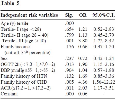 Finally, the risk factors were quantified by logistic regression analysis (Table-5). Adjusted for sex and social class, age over 45 years (OR, 3.8, 95% CI, 1.72 – 8.40), FBG 5.6 mmol/l or more (OR, 3.8, 95% CI, 1.72 – 8.40), ACR 17.2 or more (OR, 2.0, 95% CI, 1.17 – 3.51) and family history of CHD (OR, 4.4, 95% CI, 1.56 – 12.22) proved to have an excess risk for CHD. The other known risk factors like higher BMI and WHR and dyslipidemia (high cholesterol or TG or LDL and low HDL) and smoking habits were found not significant for CHD in this study population.