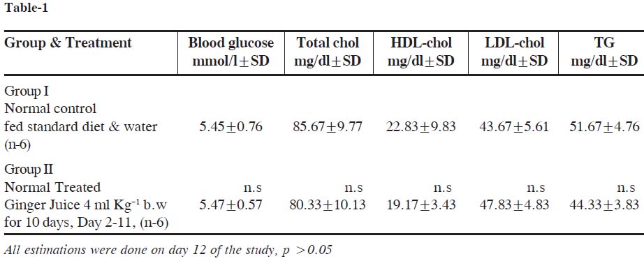 Table-1: Effects of Zingiber officinale (ginger) juice on lipid profile in normal (non-diabetic) rats