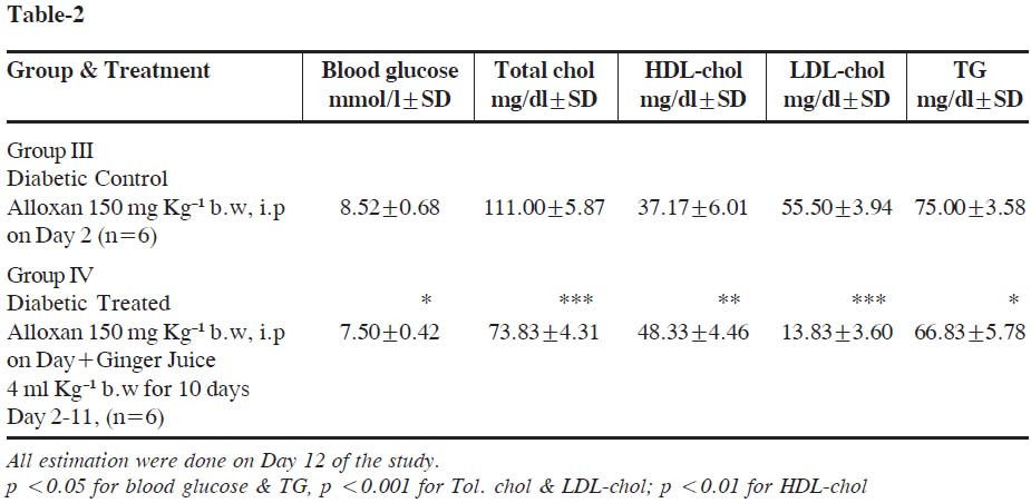 Table-2: Effect of Zingiber officinale (ginger) juice on lipid profile in diabetic rats