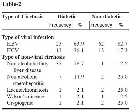 Of all (166) the cirrhotic patients, 111 had viral cirrhosis and 55 patients had non-viral cirrhosis. HBV infection was dominant in both diabetic (63.9%) and non-diabetic patients (82.7%) while majority (78.7%) of the diabetic patients suffered from non-alcoholic fatty liver disease. [Table-2]