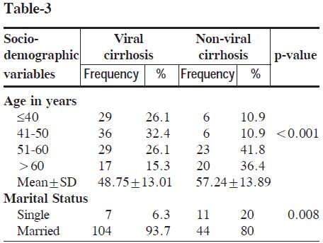 Table-3: Distribution of socio-demographic variables by cirrhosis of liver