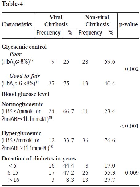 Mean age for developing viral cirrhosis was lower (48.75 ±13.01 years) than the mean age for developing non-viral cirrhosis (57.24±13.89 years). Majority (32.4%) of the cirrhotic patients of viral origin were in the age group of 41-50 years while majority (41.8%) of the cirrhotic patients of non-viral origin were in the age group of 51-60 years and this difference was found statistically significant [χ2(3)=20.97, p<.001]. Both viral and non-viral cirrhosis were significantly higher among married patients [χ2 (1) =7.133, p<.05]. Though both viral (66.7%) and non-viral (61.8%)cirrhosis were predominant among the males than their counterpart females but this sex differential was not statistically significant [χ2(1)=0.38, p=0.54]. Non-viral cirrhosis was significantly higher among the patients with hyperglycemia (76.6%) [χ2(1)=15.65, p<.001], poor glycaemic control (59.6%) [χ2(1)= 9.86, p<.01] and longer duration of diabetes (83.0%) [χ2(2)=9.51, p<.01]. [Table-4] Among the diabetics, majority (28.3%) patients had non-viral cirrhosis while 21.7% had viral cirrhosis while majority (45.2%) of the non-diabetes patients had viral cirrhosis and only 4.8% had non-viral cirrhosis and this difference was statistically significant [χ2(1)=41.36, p< .001].