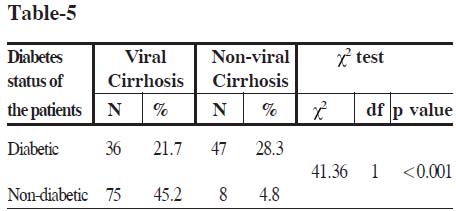 Table-5: Relationship between diabetes mellitus and cirrhosis of liver
