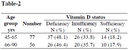 Table-2 shows that 81.9% (deficient 48.1% and insufficient 33.8%) and 84.1% (deficient 46.4% and insufficient 37.7%) of study population belonging to 45-65 and 66-90 years age group respectively had low vitamin D levels. There was no significant (p>0.05) difference of any category of vitamin D levels between the two age groups.