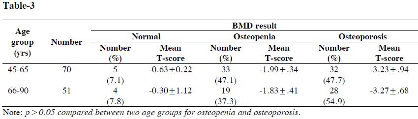 Table-3: Status of BMD in different age groups of study population (N=121)