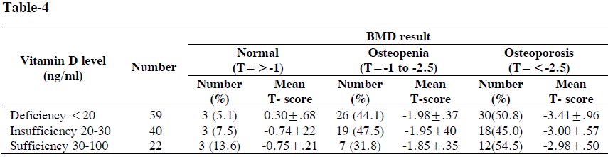 Table-4: Distribution of BMD categories of study population according to vitamin D level (n=121)
