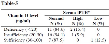 Table-5: Serum iPTH levels in women with different grades of Vitamin D status (n=38)