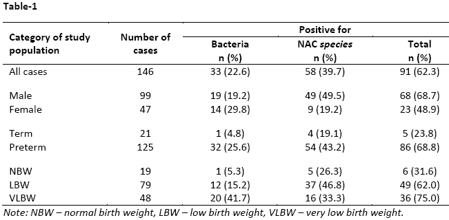 A total of 146 neonates with suspected sepsis were enrolled in the study. Out of 146 suspected cases of neonatal sepsis, 91 (62.3%) yielded positive blood culture. NAC species was isolated from 58 (39.7%) cases and remaining 33 (22.6%) yielded growth of bacteria (Table-1). Detail rate of isolation of NAC species from different categories of study population is shown in Table-1. Rate of isolation of NAC species from term and preterm babies were 19.1% and 43.2% respectively. Fungal culture positivity among normal birth weight (NBW), low birth weight (LBW) and very low birth weight (VLBW) babies were 26.3%, 46.8% and 33.3% respectively. Of the 58 NAC species isolated, 3 were from neonates with early-onset sepsis and the rest 55 were from cases with late-onset sepsis. The ratio of isolation of NAC species in neonates of diabetic and non diabetic mother was 2:1. Table-2 shows that C. tropicalis was the predominant species (81.0%) followed by C. parapsilosis (12.1%), C. auris (5.2%) and C. dubliniensis (1.7%).