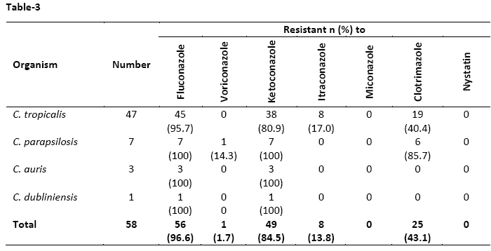 Susceptibility of NAC species to fluconazole, ketoconazole, itraconazole, clotrimazole and nystatin by disc diffusion method is shown in Table-3. Out of 58 NAC isolates, 96.6%, 84.5%, 13.8% and 43.1% were resistant to fluconazole, ketoconazole, itraconazole and clotrimazole respectively. Except one C. parapsilosis isolate, none was resistant to voriconazole. None of the isolated NAC species was resistant to miconazole and nystatin.