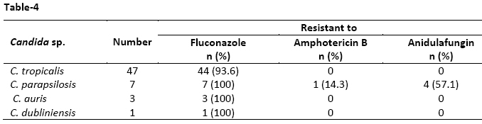 Table-4: Antifungal susceptibility pattern of isolated NAC species to fluconazole, amphotericin B and anidulafungin by MIC method