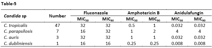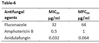 Table-5: MIC50 and MIC90 of fluconazole, amphotericin B and anidulafungin of isolated NAC species