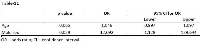 Table-11: Logistic regression analysis showing the influence of age and sex on outcome