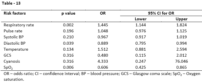 Table-13: Univariate logistic regression showing impact of clinical parameters at admission on outcome (death/referral)
