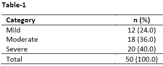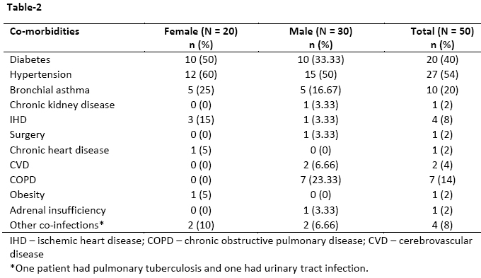 Total of 50 RT-PCR positive COVID-19 patients fulfilling the inclusion criteria were included in the study. Out of 50 cases, 20 were females and 30 males. Mean age of the study population was 46.00 ± 16.45 years (95% CI: 41.3, 50.7). Table-1 shows that 18 (36%) and 20 (40%) cases had moderate and severe diseases respectively. The prevalence of co-morbidities among the study population is shown in Table-2. Other than the COPD, the prevalence of co-morbidities was not significantly different between sexes. All the COPD patients were male and smokers. There was a significant association between smoking and COPD (p < 0.05 by chi-square).