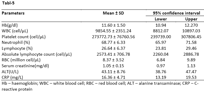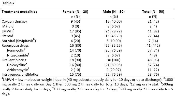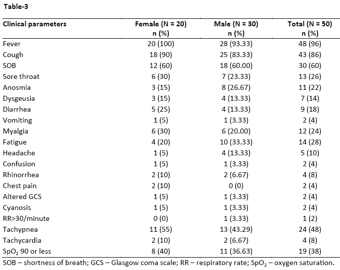 Detail haematological and biochemical parameters are shown in Table-5. The overall mean haemoglobin level was 11.6 ± 1.5 g/dl; however, the haemoglobin level was significantly (p < 0.05) lower in female patients compared to males (10.9 ± 1.09 gm/dl vs 12.8 ± 1.41 gm/dl, 95% CI: -2.99, -0.758). No patient had absolute lymphocytopenia (lymphocyte count < 1000 cells/µL), 4 patients had total white cell count (WBC) count of more than 11000 cells/µL and only one patient had thrombocytopenia (platelet count < 150,000 cells/µL). Chest X-Ray revealed bilateral consolidation of lungs in 36 (72%) cases while 13 (26%) had no lung abnormalities (Table-6). Only 7 (14%) patients were treated with antiviral drugs (favipiravir); most of the patients received oral or parenteral antibiotics (Table-7).