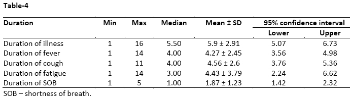 Fever was the most common symptom (48/50, 96%) followed by cough (43/50, 86%). About half of the patients had tachypnea; however, only one patient had a respiratory rate of more than 30/minute. Glasgow coma scale (GCS) was impaired in two cases; both were hypoxemic (SpO2: 84% and 88%). Their illness began 1 to 16 days before admission (Table-4).