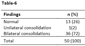 Table-6: Findings of the X-Ray chest P/A view (n=50)