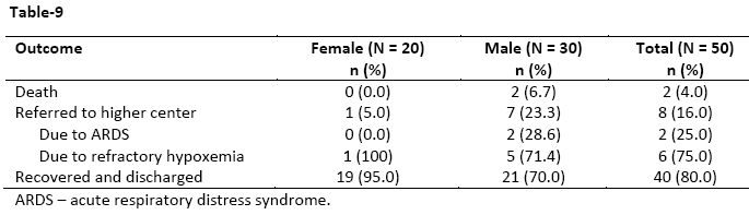 Of the 34 patients re-tested, nearly all (82.4%) became RT-PCR negative for the virus by 10 days (Table-8). The median time of hospital stay was 6 days with a minimum of 1 day and a maximum of 40 days. Forty patients (80%) had recovered and were discharged after a median time of 7 days (Table-9), two patients died, and rest of the 8 patients were transferred to higher centers for respiratory support. The patients who died or were transferred to the higher center had significantly lower hospital stay time (mean 2.82 ± 2.9 days, minimum of 1 day to maximum 9 days with a median of 1 day) than those who discharged (mean 8.87 ± 6.9 days, minimum 3 days to maximum 40 days with a median of 7 days; 95% CI: 2.259, 11.091; p < 0.05). Based on median hospitalisation time, 15 (37.5%) patients who recovered had extended hospital stay of more than 7 days.