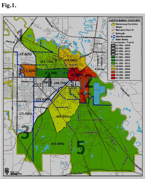 Fig.1: Distribution of low income areas in the City of Hattiesburg, Mississippi