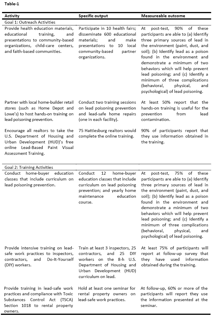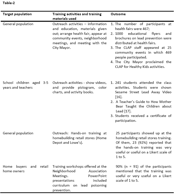 Project goals, activities, and measurable outcomes: The primary goals of the research included: 1) Encourage health promotion by conducting community-based outreach (such as health fairs, distribution of educational materials, and public appearances) concerning childhood lead poisoning prevention; and 2) Encourage health promotion by conducting community-based educational andtraining activities (such as seminars, workshops, and classroom or online training) on childhood lead poisoning prevention. The project activities, the specific project outputs, and the measureable outcomes for each activity are narrated in Table-1.