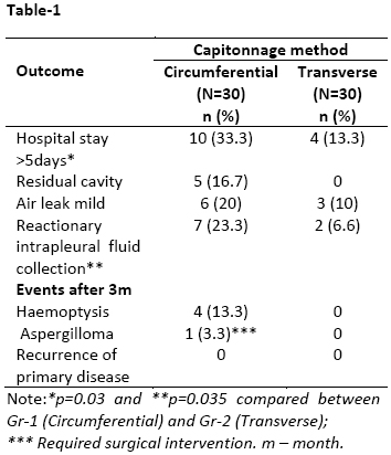 Results: Ten cases (33.33%) of Group-1 had hospital stay for more than 5 days compared to 4(13.33%) in Group-2 (p=0.03). Out of 30 patients who had undergone circumferential closure of the hydatid cavity, 5 (16.67%) patients had residual cavitatory fluid collection while there was none in the other group. In Group-1, 7 (23.3%) cases had reactionary intrapleural fluid collection compared to 2 (6.6%) in Group-2 (p=0.035). After 3 months of follow-up, 4 patients in circumferential capitonnage had mild haemoptysis and 1 had aspergilloma while no such complication occurred in any patient in the transverse capitonnage group. No recurrence of cyst occurred in any case in both groups.
