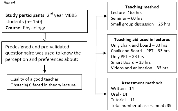 The present study was conducted at Adesh Medical College and Hospital, Shahabad among 150 students of second year MBBS course (Batch 2017-2018). A total of 11 systems in physiology were taught by lectures (165 hours), seminars (60 hours) and small group discussions (25 hours) during the first year MBBS course. These lectures were taken using different teaching aids like chalk and board along with power point presentation (PPT), only chalk and board, only PPT, smart boards and videos and animation. Out of total 39 assessments taken (including formative and summative), 14 were written assessment, 14 were oral assessments and 11 were tutorials. Questionnaire was prepared keeping in view the teaching learning and assessment methods used in this college. This predesigned and prevalidated questionnaire was given to second year students to know their perception and preferences about teaching learning methods, teaching aids and assessment methods used in teaching physiology curriculum during the first year MBBS course (Figure-1)