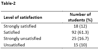 Regarding the satisfaction of the students about current teaching learning methods, 18 (12%) students were strongly satisfied, 92 (61.3%) were satisfied, while 25 (16.7%) and 15 (10%) students were unsatisfied and strongly unsatisfied respectively (Table-2).