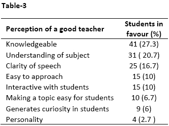 Students’ perception about the quality of a good teacher is shown in Table-3. Of the total students, 41 (27.3%) students stated that a good teacher should be knowledgeable while 31 (20.7%) students expressed that the teacher should have good understanding of subject. Twenty five (16.7%) students wanted that teacher should be audible and should have clear speech while 10% students want that teacher should be easy to approach and interactive with students. Very few students 9 (6%) expressed that ability to generate curiosity in students as a quality of a good teacher.