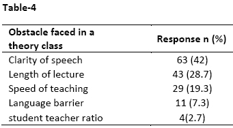 Common obstacles faced by the students in theory class are shown in Table-4. Out of total 150 students, 63 (42%), 43 (28.7%) and 29 (19.3%) students stated lack of clarity of speech, length of lecture and speed of teaching respectively were the most common obstacles they faced during the theory class. Only 2.7% students found student teacher ratio as an obstacle during theory class.