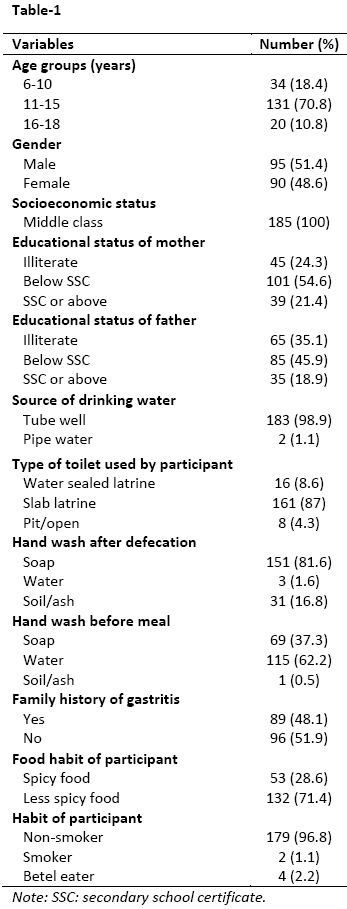 A total number of 185 apparently healthy asymptomatic children and adolescents were enrolled in the study of which 34, 131 and 20 were in 6-10, 11-15 and 16-18 years age groups respectively. Socio-demographic variables of the participants are shown in Table-1. Almost equal number of male (51.4%) and female (48.6%) participated in the study. All were from middle socio-economic class. Of the enrolled children, 35.1% and 24.3% of their fathers and mothers were illiterate while remaining had access to academic education. Almost all (98.9%) used tube well water for drinking. Most of the participants (87%) used slab latrine. Though 81.6% washed hand with soap after defecation, only 37.3% washed hand with soap before meal. Around 48.1% had family history of gastritis whereas 51.9% had no such history. More than two third of individuals (71.4%) provided history of eating less spicy food. Most of the participants (96.8%) had no history of smoking.