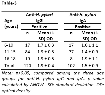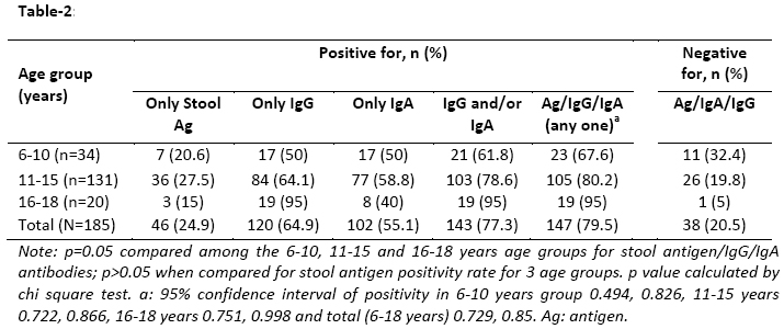 Table-2: Rate of H. pylori infection in different age groups of study population as determined by presence of stool antigen and serum anti-H. pylori IgG/IgA antibodies