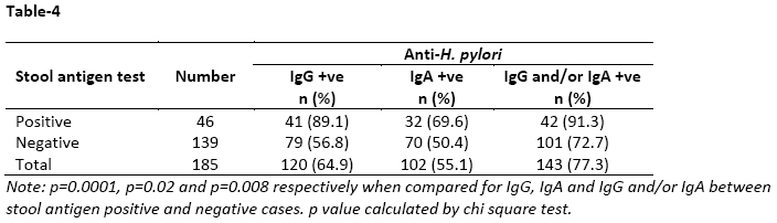 Table-4: Comparison of stool antigen with the presence of serum anti-H. pylori IgG and IgA antibodies
