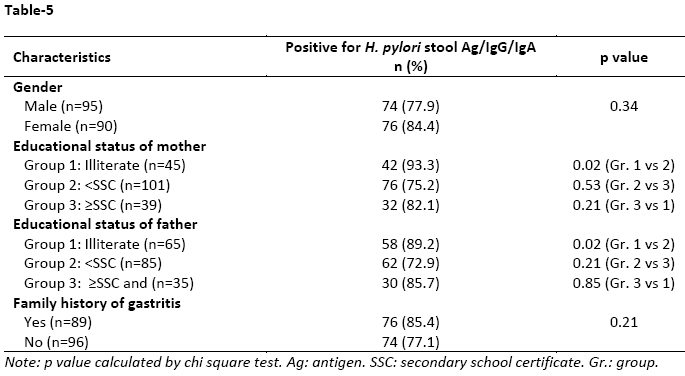 Table-5: Status of H. pylori infection according to the socio-demographic characteristics of the study population (N=185)