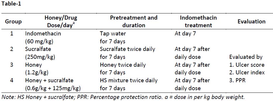 Results: UI significantly (p < 0.001) reduced in sucralfate, (0.67 ± 0.82), honey (0.83 ± 0.98) and honey + sucralfate (0.17 ± 0.41) treated group compared to only indomethacin treated group (4 ± 0.63).The PPR of sucralfate, honey and honey + sucralfate was 83.25%, 79.25% and 95.75%, respectively.