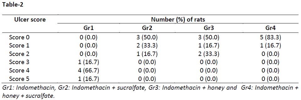 Table-2: Ulcer score of rat stomachs treated with high dose indomethacin, sucralfate, honey and mixture of honey and sucralfate.