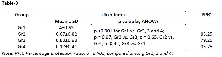 Table-2 shows the ulcer scores of the Group 1 to 4 of the study groups. Ulcer scores were between 3-5 (score 4 - 66.7% and score 3 and 5 - 16.7% each) of Gr1 rats receiving high dose of indomethacin. Rats of Gr2, Gr3 and Gr4 had ulcer scores from 0 to 2. In Gr4, 83.3% rats pre-treated with mixture of honey and sucralfate had ulcer score of 0. None of the rats in Gr2, 3 and 4 had ulcer score 3-5. Ulcer index of rats receiving sucralfate (Gr2), honey (Gr3) and sucralfate + honey (Gr4) was significantly (p< 0.001) less compared to that of indomethacin group (Gr1) (Table-3). However, no significant difference of ulcer index was observed among the rats of Gr2, 3 and 4. PPRs were 83.25%, 79.25% and 95.75% against high dose indomethacin induced ulcer in sucralfate, honey and sucralfate + honey pre-treated groups respectively. PPRs of different groups were not significantly different from each other (p>0.05).