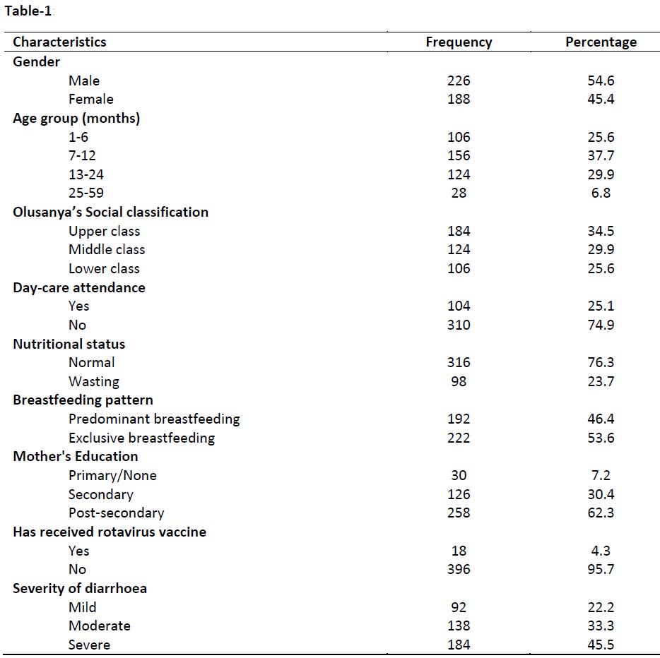 General characteristics of the study population: The socio-demographic characteristics of the study participants are shown in Table-1. Of the 414 children enrolled in the study, 226 (54.6%) were male and 188 (45.4%) female, with a male to female ratio of 1.2:1. The mean age of the children was 12.1 months, ranging from 1-59 months. Of the total diarrhoea cases, 93.2% (386/414) were below the age of 24 months and only 6.8% (28/414) were between the age of 25 – 60 months. More than three of every five (76.3%) children had normal nutrition, 53.6% had exclusive breastfeeding, and more than half (62.3%) of the mothers had post-secondary education. Only 18 (4.3%) children had received the rotavirus vaccine in this study. Severe diarrhoea was present in 184 (45.5%) cases.