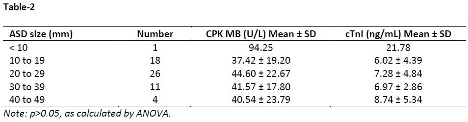 Table-2: Post surgery serum CPK-MB and cTnI levels in patients with different sizes of atrial septal defects (n=60)