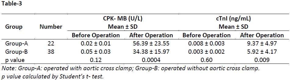 Table-3: Serum CPK-MB and cTnI levels in ASD cases before and after the operation with and without the application of aortic cross clamp