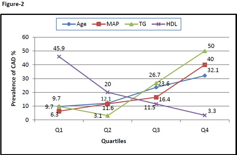 Whether the prevalence of CAD was related to advancing age, increasing mean arterial pressure (MAP), TG and decreasing with increasing HDL level are shown in Figure-2. The prevalence of CAD according to quartiles of age, MAP, TG and HDL were estimated by chi-sq trend with level of significance (chi-sq, p). The trends were significant for the quartiles of age (33.6, <0.001), (MAP: 75.7, p<0.0001), TG (23.5, <0.001). As expected, HDL had inverse association with CAD prevalence (20.2, <0.001), which indicated that low HDL level had higher risk of developing CAD.