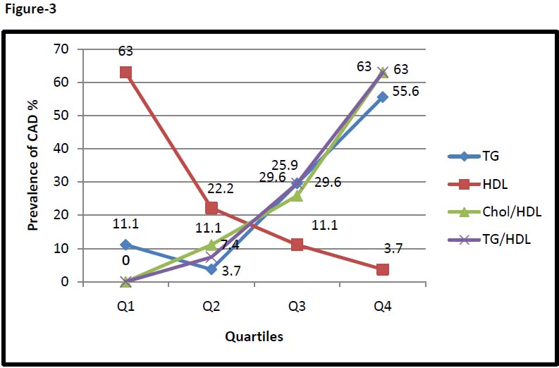 Figure-3: Prevalence (%) of CAD according to quartiles (Q1, Q2, Q3, Q4) of TG, HDL, T-Chol / HDL ratio and TG / HDL ratio. The trends were significant (chi Sq, P) for increasing quartiles of TG (23.5, <0.001) and decreasing HDL (20.2, <0.001), T-Chol/HDL ratio (30.7<0.001) and TG/HDL ratio (30.7, <0.001). Quartile values of TG, mg / dl: Q1 <153, Q2 154 - 201, Q3 202 - 280, Q4 >280; Quartile values of HDL mg / dl: Q1 <41, Q2 41 - 48, Q3 48 - 53, Q4 >53; Quartile values of TG/HDL; Q1 <3.03, Q2 3.04 - 4.23, Q3 4.24 - 6.77, Q4 >6.77; and Quartile values of T-Chol/HDL ratio: Q1 <3.75, Q2 3.76-4.83, Q3 4.84-5.63 and Q4 >5.63. * Values for HDL, cholesterol and TG, and ratios were estimated in mg/dL.