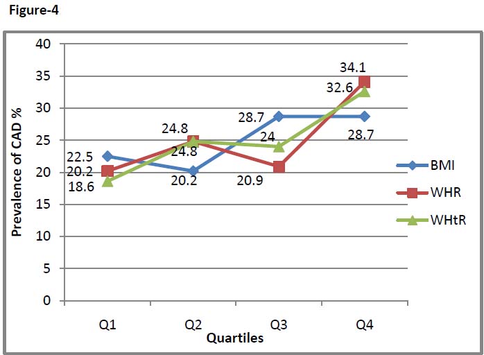Figure-4: Prevalence (%) of CAD according to quartiles (Q1, Q2, Q3, Q4) of BMI, WHR and WHtR.. Quartile values of BMI: Q1 <22.2, Q2 22.3 - 24.3, Q3 24.4 - 26.5, Q4 >26.5; Quartile values of WHR: Q1 <0.95, Q2 0.96 - 0.98, Q3 0.99 -1.01, Q4 >1.01; Quartile values of WHtR Q1 <0.52, Q2 0.53 - 0.55, Q3 0.56 - 0.6, Q4 >0.6.