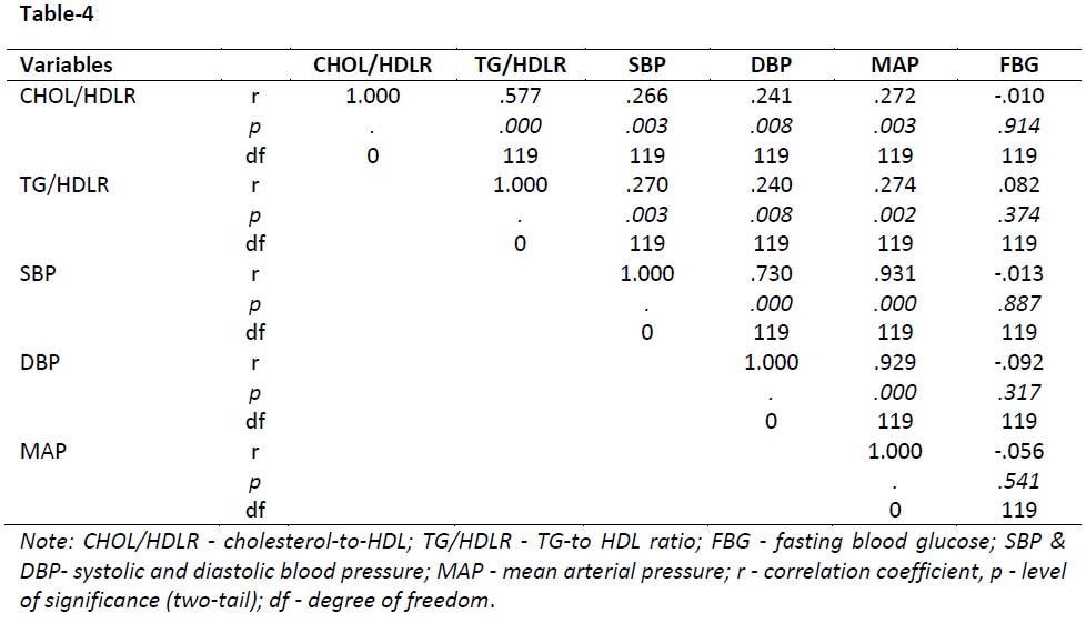 Table-4: Correlations of BP measures with metabolic variables like ratios of lipid fractions (CHOL/HDLR, TG/HDLR) and FBG.